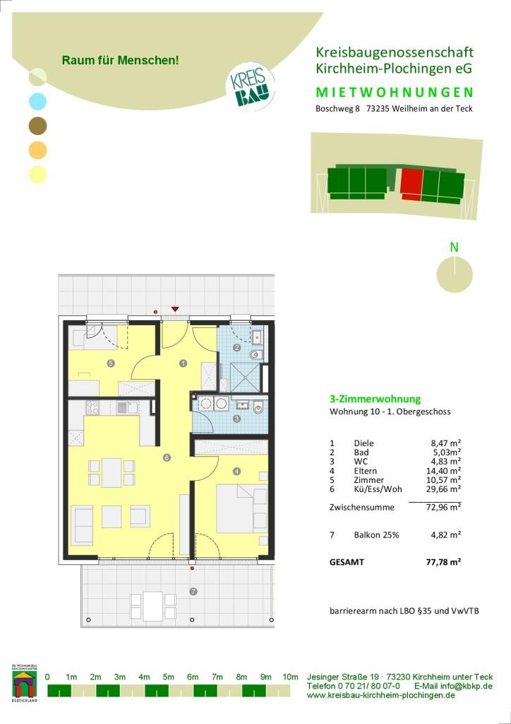 3-Zimmer Genossenschaftswohnung im 1. OG barrierearm nach LBO § 35 im Boschweg 8 in 73235 Weilheim an der Teck.
