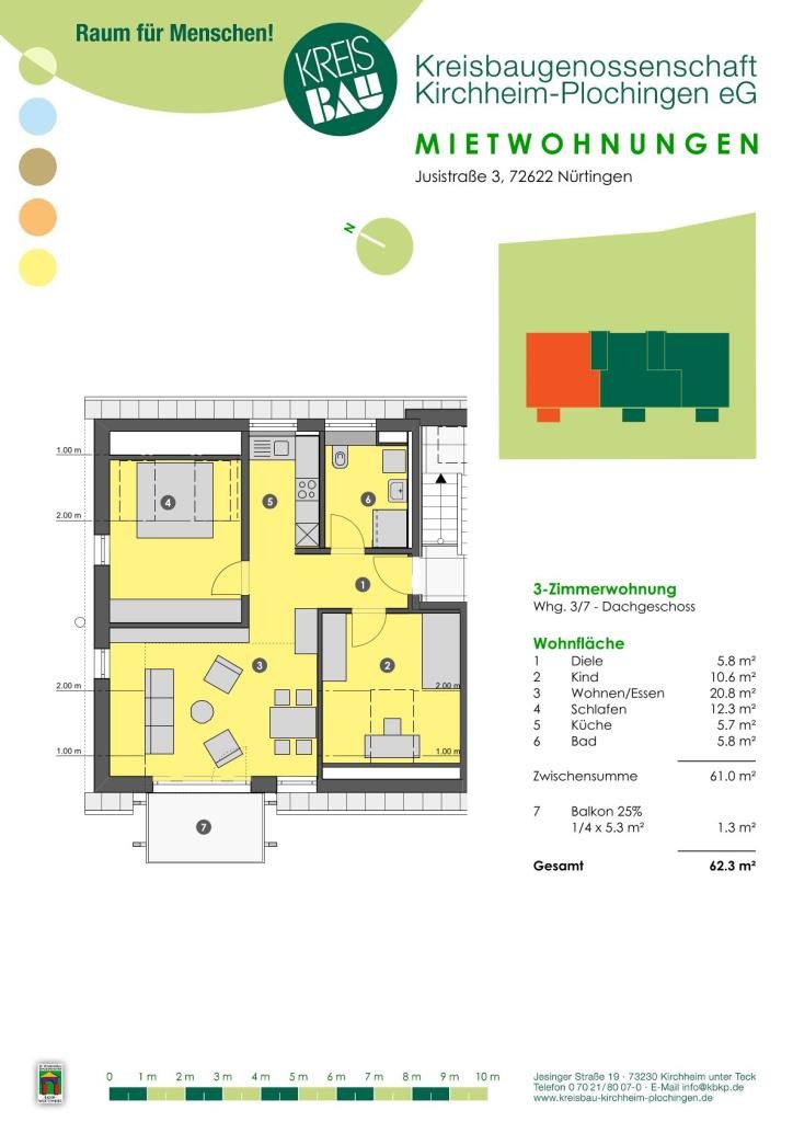 unsere 3- Zimmer- Wohnung befindet sich im Dachgeschoss eines 12 Mehrfamilienhauses in ruhiger Lage, Jusistraße 3 in 72622 Nürtingen.
