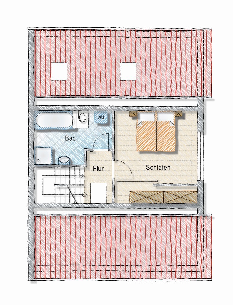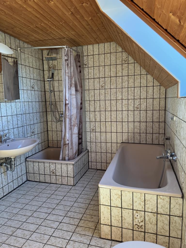 Über eine stilvolle Treppe erreichen Sie das obere Dachgeschoss. Hier erwartet Sie ein behagliches Schlafzimmer mit gemütlichem Charme – der perfekte Rückzugsort für erholsame Nächte. Das angrenzende Tageslichtbad ist gepflegt und mit Badewanne, Dusche, WC und Waschmaschinenanschluss ausgestattet. Eine spätere Modernisierung ist möglich und bietet viel Potenzial zur individuellen Gestaltung.
