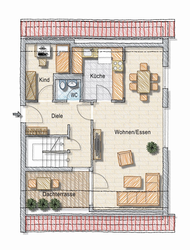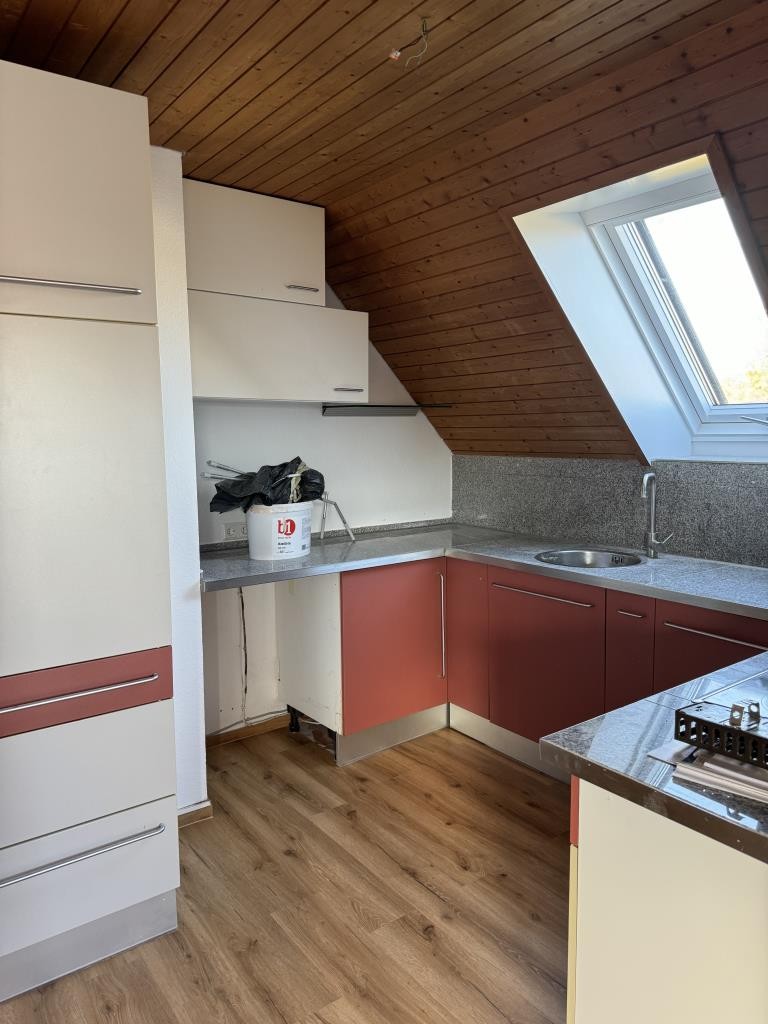 Der Eingangsbereich empfängt Sie mit einem praktischen Flur, der in den lichtdurchfluteten Wohn- und Essbereich führt. Großzügige Fensterflächen schaffen eine helle, freundliche Atmosphäre, während der Zugang zur Dachterrasse den Wohnraum ideal ergänzt. Genießen Sie hier entspannte Stunden im Freien mit einem herrlichen Blick über die Dächer von Ötlingen bis hin zur Schwäbischen Alb – ein echtes Highlight dieser Wohnung.